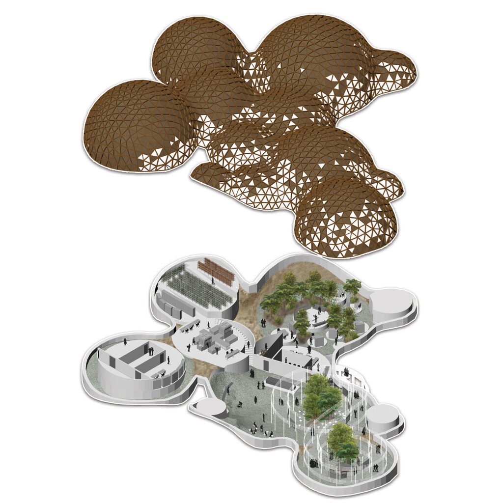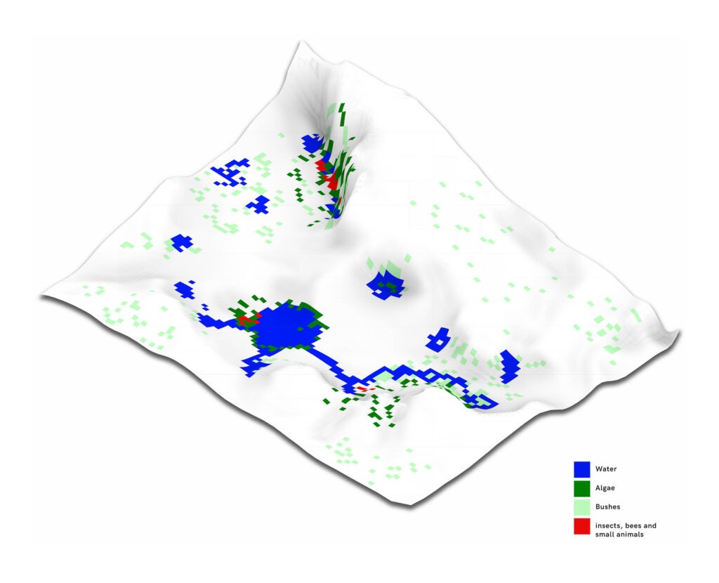 As the last step, a generating algorithm was created that created the shell structure with an opening in direction of marked spaces which could move on the site. Optimization was done on the following criteria: