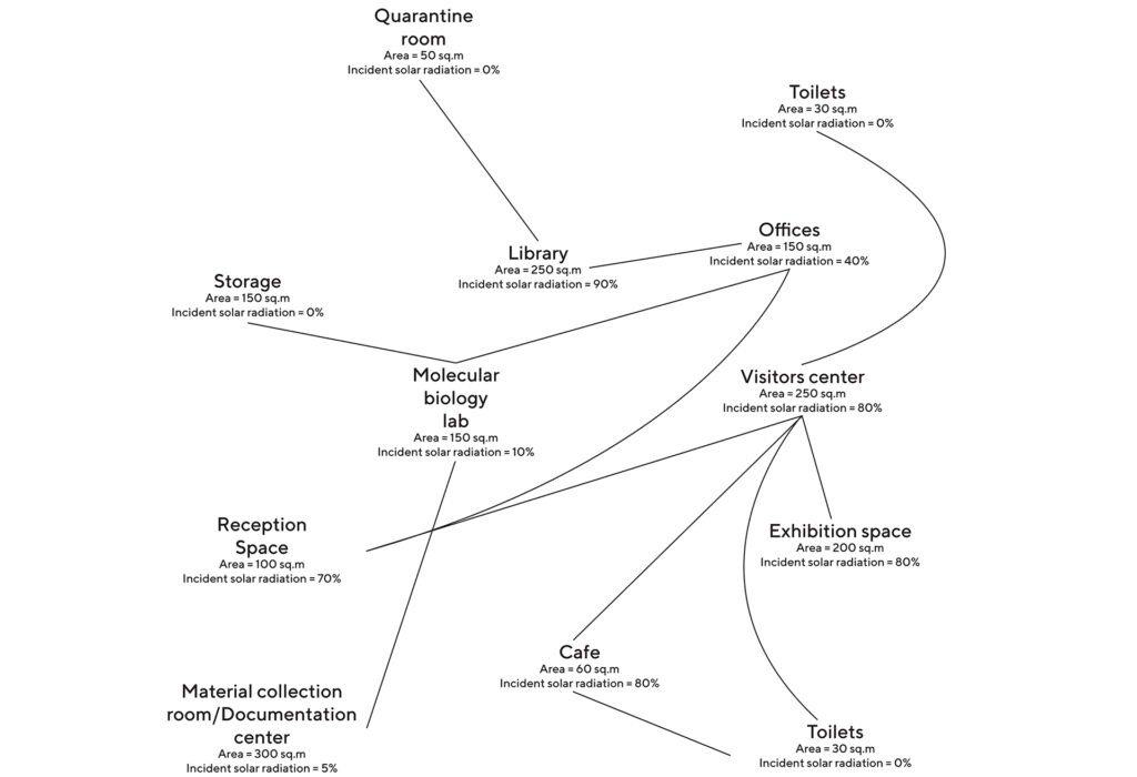 Spaces like laboratories work best in artificial lights and hence require very few openings. On the other hand, exhibition space and visitors. The center can have lot opening. An interrelationship is also set between each space. This decides which spaces should be besides which one.