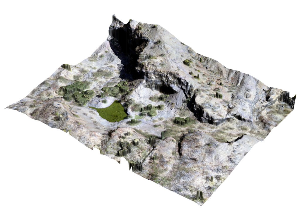 The basalt quarry was mapped with the help of drone (Lidar). After obtaining a height map from the drone image, the points were extruded to make a three dimensional model. A textured map was overlayed on the three dimensional model to obtain accurate information about the site.