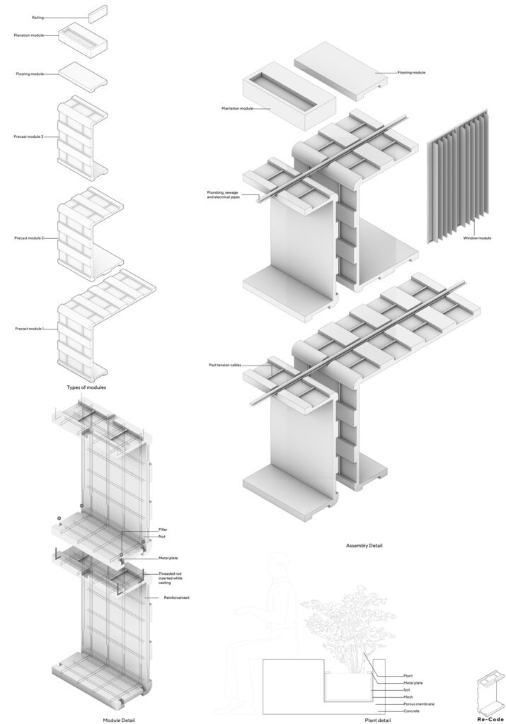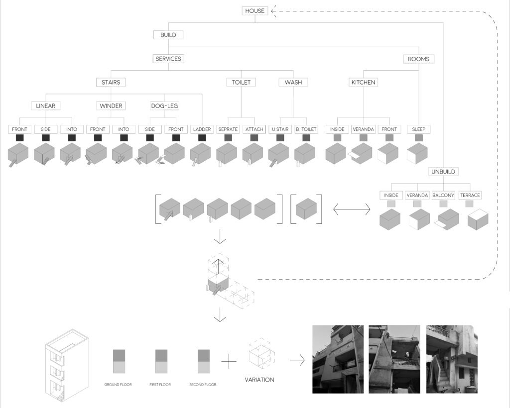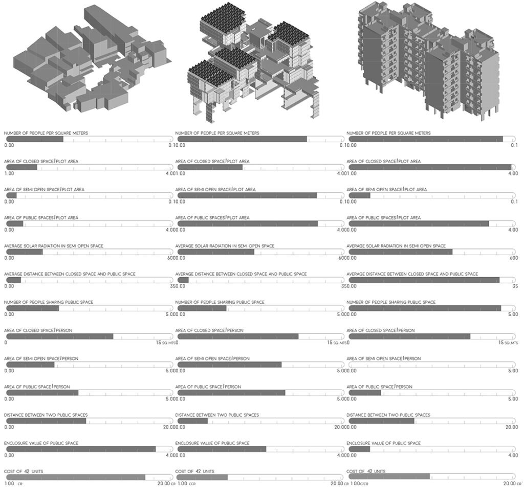 To find out the amount of solar radiation that needs to be attained in semi-open spaces and closed spaces, several clusters were studied from the village and a range was obtained. The same was done for the sky view factor. Based on the parameters we got, an evaluating algorithm was made. The script also made sure that the building design finally achieved could be made from precast modules.